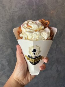 Cauldron offers 3 types of Puffle cones; traditional, churro, and red velvet. I got to try the traditional and the churro. I really liked both of them! It felt like eating a puffy waffle cone. The flavor was basically the same to that of a traditional waffle cone, but the texture was closer to that of a breakfast waffle. You should choose whichever Puffle flavor is most intriguing to you, not the one that will go the best with your ice cream. The cones are difficult to eat at the same time as the ice cream so they become separate entities. The Puffle Cones were fairly expensive ($7 per cone), but they were very big and included a lot of ice cream, so you could share with a friend if you wanted to.